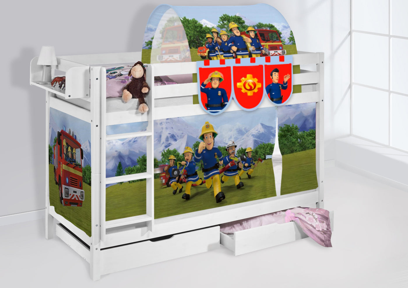 Kinder Etagenbett JELLE 1054 mit 2 Lattenrosten & Vorhang Feuerwehrmann Sam 200x90 cm