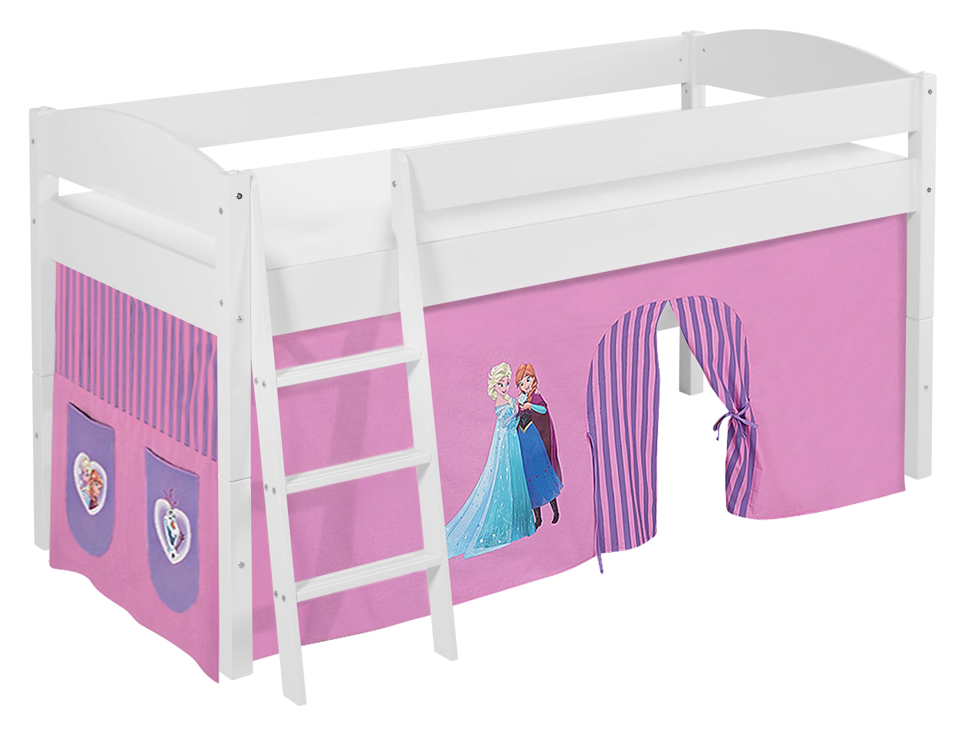 Kinder Hochbett IDA Classic in weiss mit lila FROZEN / Eiskönigin / Anna & Elsa Vorhang. Kinderbett 200x90 cm & Spielbett von LILOKIDS