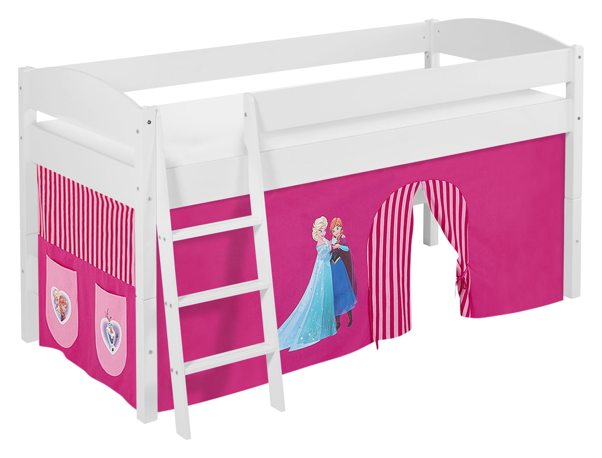 Kinder Hochbett IDA Classic in weiss mit rosa FROZEN / Eiskönigin / Anna & Elsa Vorhang. Kinderbett 200x90 cm & Spielbett von LILOKIDS