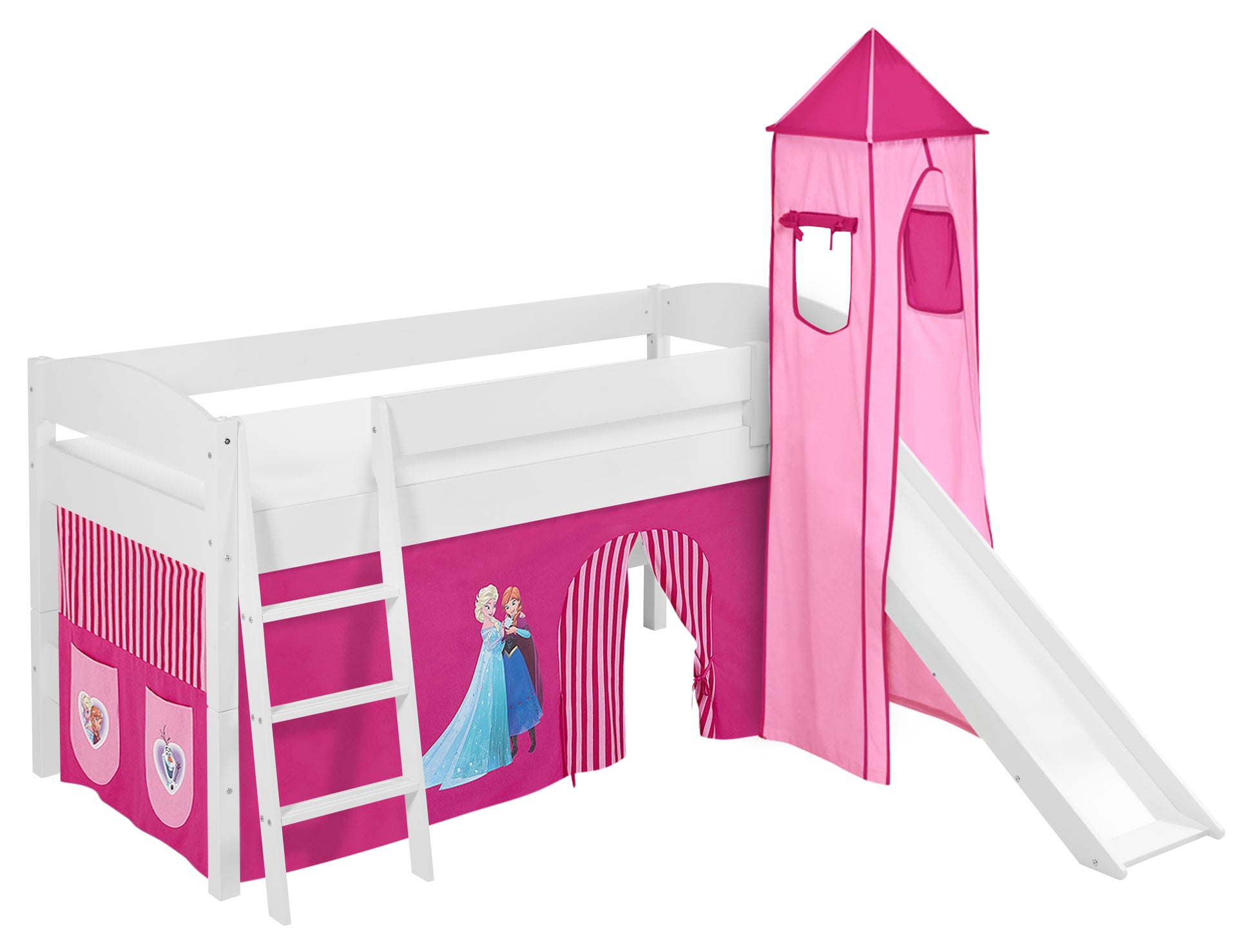 Kinder Hochbett IDA Classic in weiss mit RUTSCHE, TURM und rosa FROZEN / Eiskönigin / Anna & Elsa Vorhang. Kinderbett 200x90 cm & Spielbett von LILOKIDS