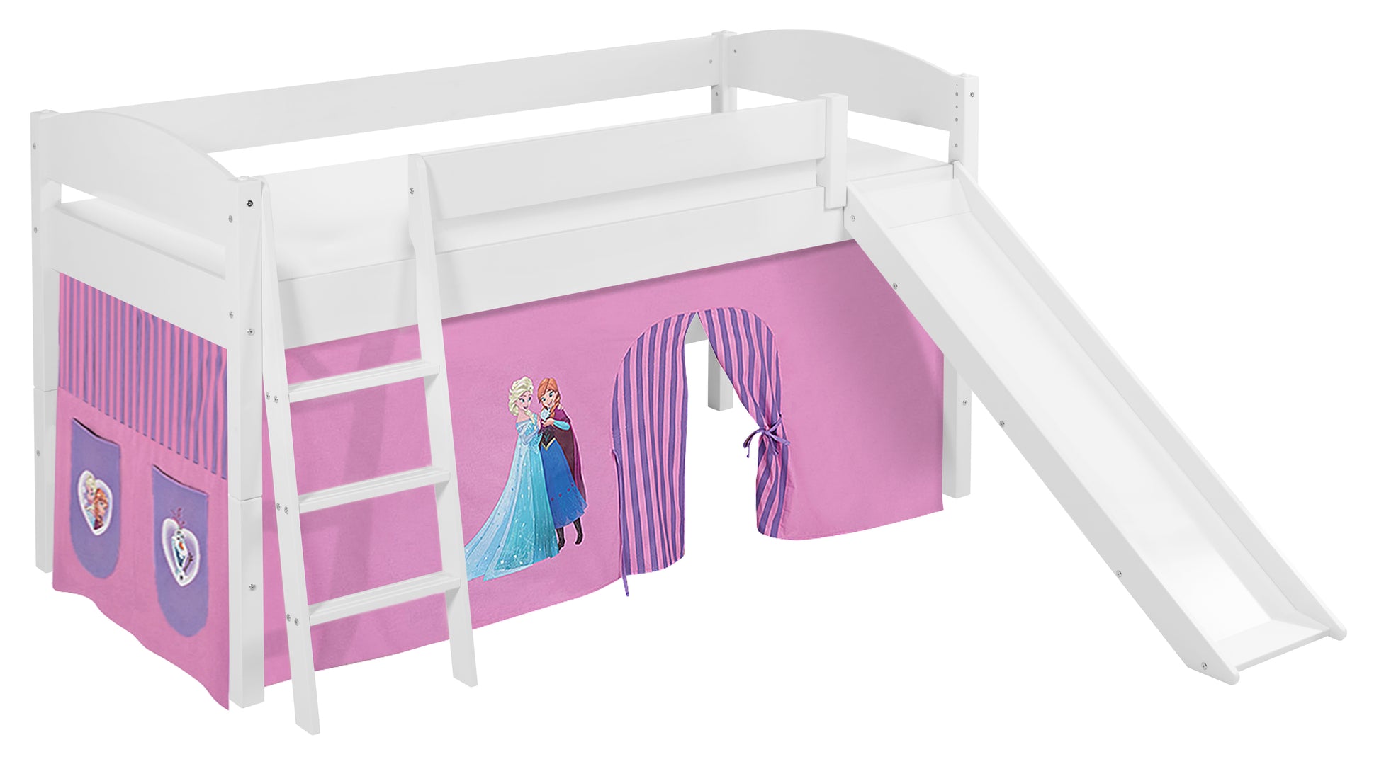 Kinder Hochbett IDA Classic in weiss mit RUTSCHE und lila FROZEN / Eiskönigin / Anna & Elsa Vorhang. Kinderbett 200x90 cm & Spielbett von LILOKIDS