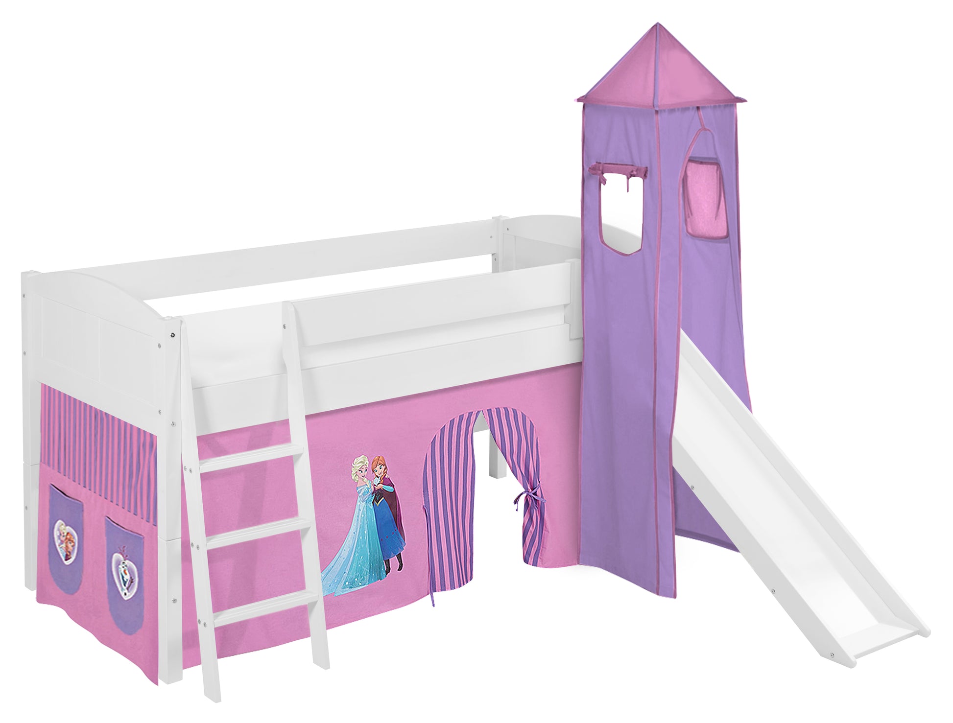 Kinder Hochbett IDA Landhaus in weiss mit RUTSCHE, TURM und lila FROZEN / Eiskönigin / Anna & Elsa Vorhang. Kinderbett 200x90 cm & Spielbett von LILOKIDS