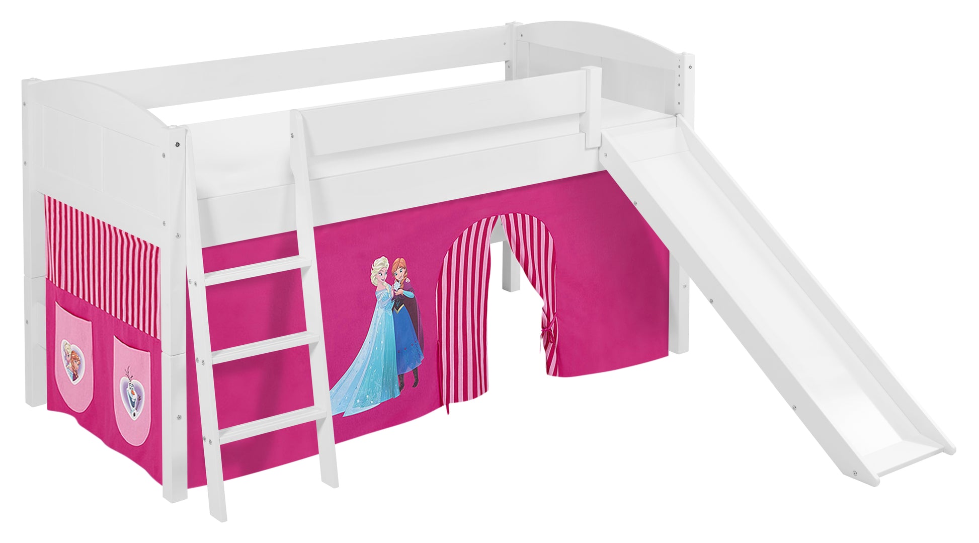 Kinder Hochbett IDA Landhaus in weiss mit RUTSCHE und rosa FROZEN / Eiskönigin / Anna & Elsa Vorhang. Kinderbett 200x90 cm & Spielbett von LILOKIDS
