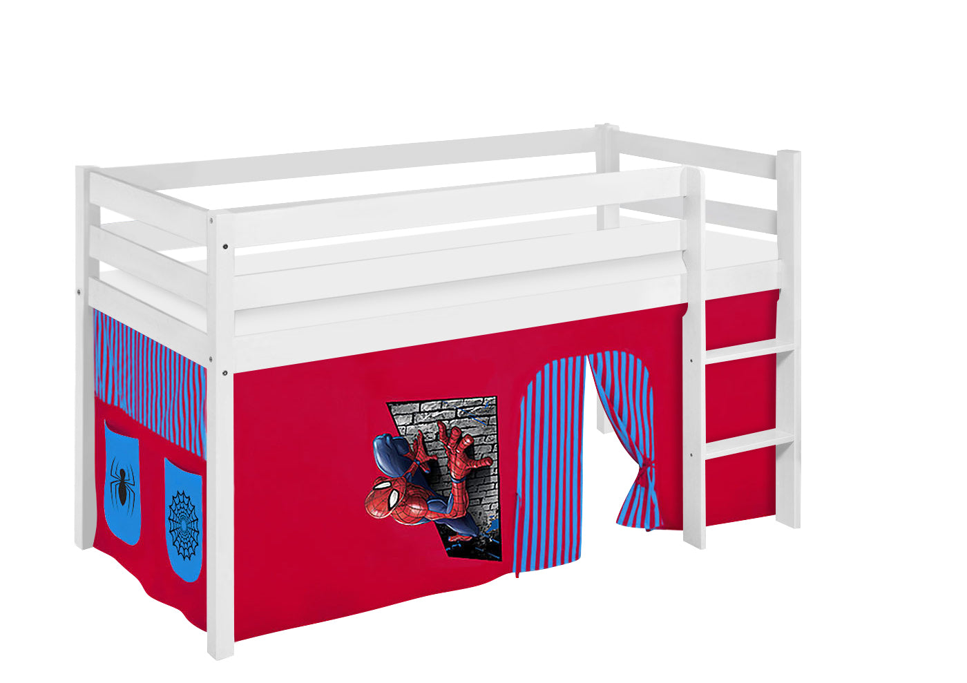 Kinder Hochbett JELLE in weiss mit Spiderman Vorhang. Kinderbett 200x90 cm & Spielbett von LILOKIDS