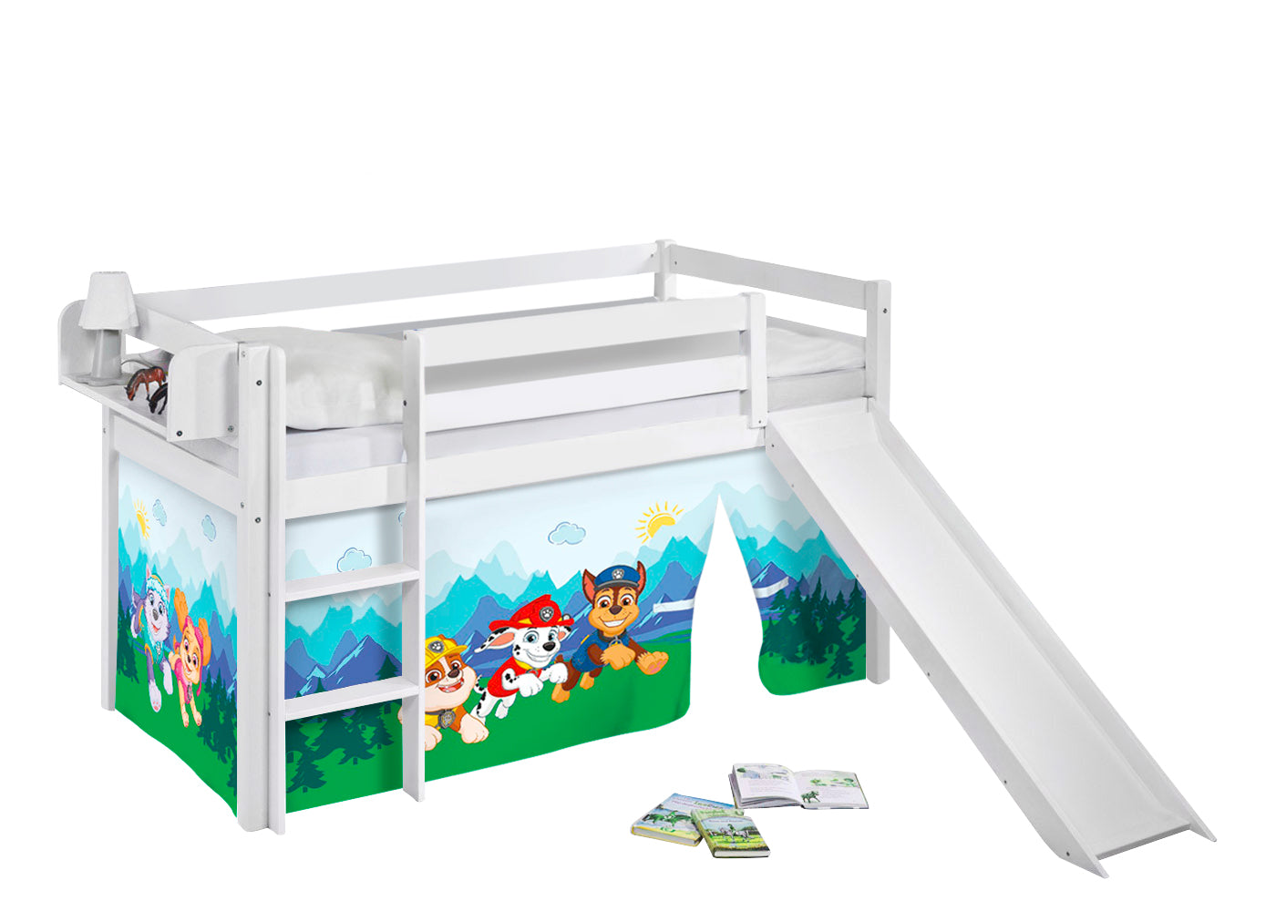Kinder Hochbett mit Rutsche JELLE 2054 weiss mit Vorhang Paw Patrol blau 190x90 cm