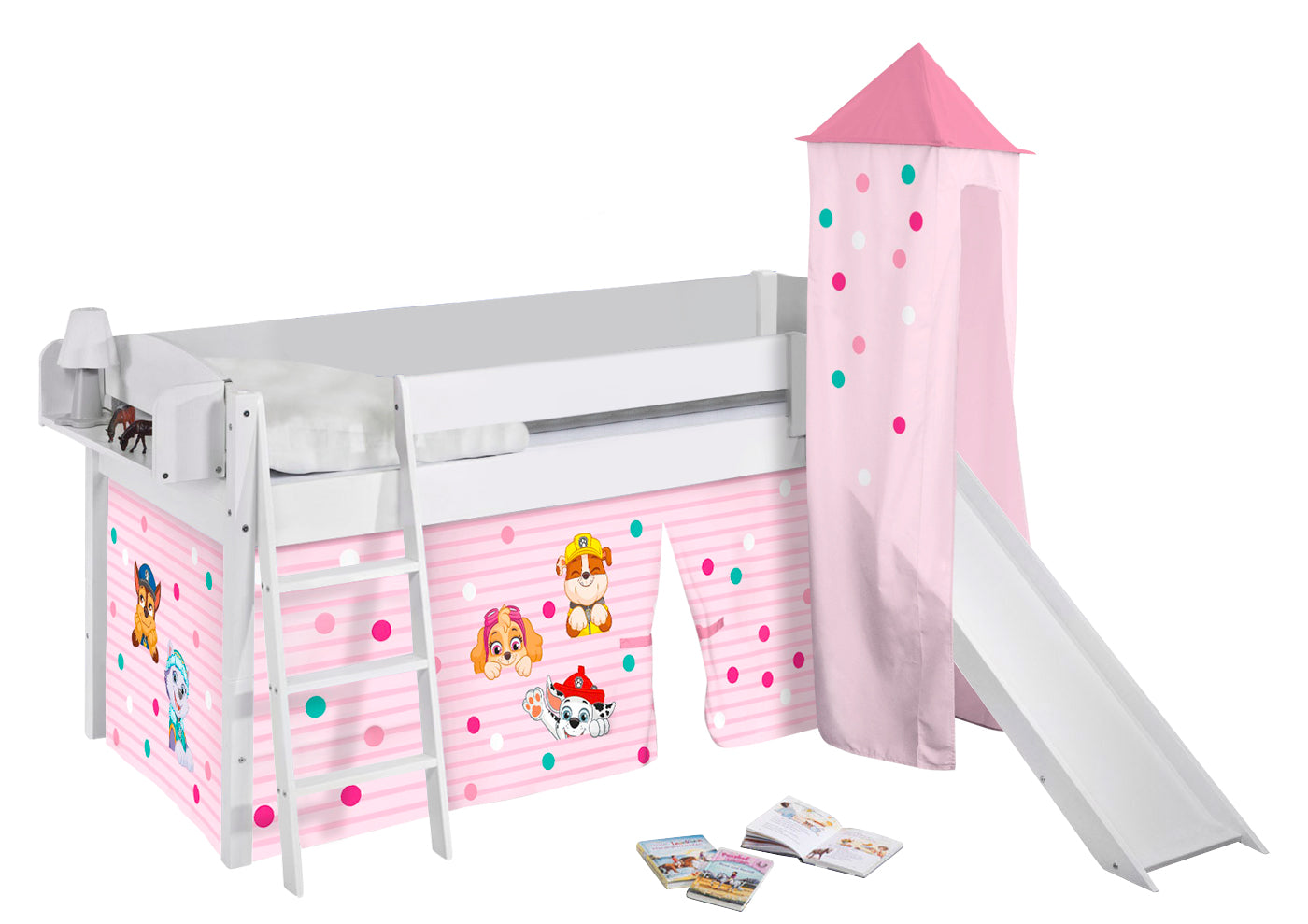 Kinder Hochbett mit Turm & Rutsche IDA 4105 Classic weiss mit Vorhang Paw Patrol rosa Spielbett 200x90 cm